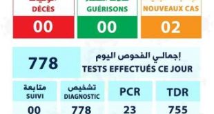وكالةأخبار اليوم : اعلنت وزارة الصحة تسجيل 02 إصابة جديدة بفيروس كورونا دون تسجيل أي حالة وفاة ولا شفاء مرتبطة بالفيروس خلال ال 24 ساعة الأخيرة. وقالت الوزارة في نشرتها اليومية إنها توصلت للنتيجة بعد إجراء 778 فحصا منها TDR:755 و PCR: 23 و 778 حالة تشخيص