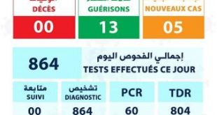 وكالة أخباراليوم أعلنت وزارة الصحة تسجيل 05 إصابات جديدة بفيروس كورونا و13 حالة شفاء دون تسجيل أي حالة وفاة مرتبطة بالفيروس خاال 24 ساعة الماضية. وقالت الوزارة في نشرتها اليومية إنها توصلت للنتيجة بعد إجراء 864 فخصا منها TDR: 804 و PCR: 60 …