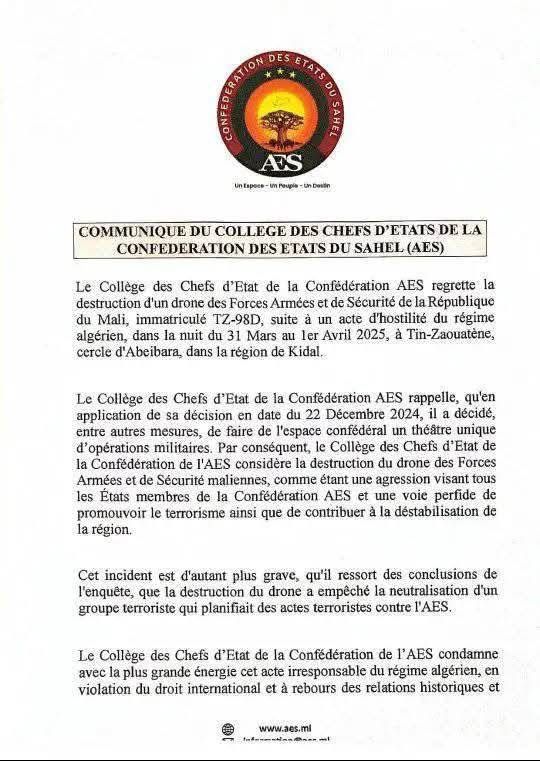 وقبل هذا البيان المشترك، أعلنت السلطات المالية تقدمها بشكوى أمام الهيئات الدولية “ضد النظام الجزائري لارتكابه أعمالا عدوانية”، تمثلت في إسقاط الجزائر قبل أيام طائرة مسيرة تابعة للجيش المالي.