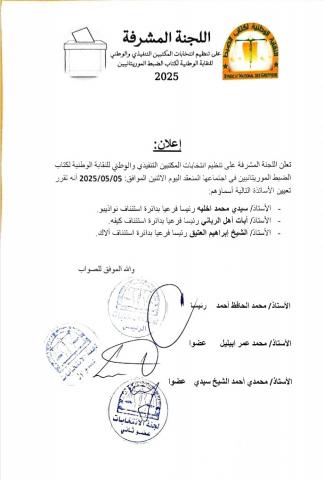 أخباراليوم. أعلنت لجنة الإشراف على انتخابات النقابة الوطنية لكتاب الضبط، المقررة يوم السبت 10 مايو 2025، عن أسماء رؤساء الفروع على مستوى دوائر الاستئناف، حيث جاءت اعلى النحو التالي: