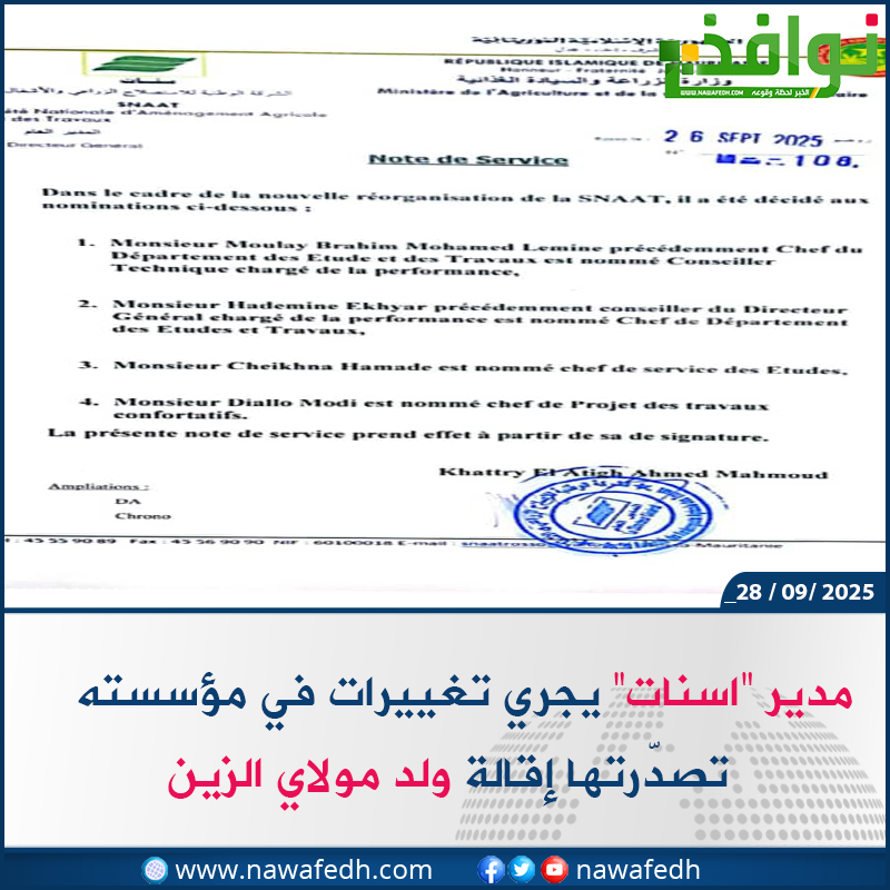 أخبار اليوم. ــ أجرى المدير العام للشركة الوطنية للاستصلاح الزراعي والأشغال “اسنات” خطري ولد العتيق تغييرات في إدارات ومصالح مؤسسته تصدرتها إقالة الإطار البارز بالشركة ومدير الأشغال السابق بها مولاي إبراهيم محمد الأمين ولد مولاي الزين، وتعيينه مستشارا فنيا.