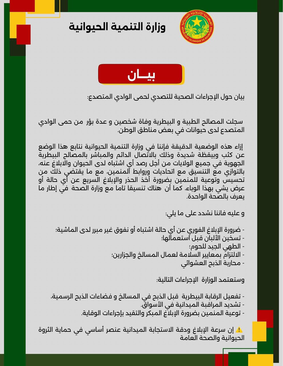 كما دعت الوزارة المواطنين إلى التبليغ الفوري عن أي حالة اشتباه أو نفوق غير مبرر لدى الماشية، مع الالتزام بمعايير السلامة بالنسبة لعمال المسالخ والجزارين، ومحاربة الذبح العشوائي، إضافة إلى تسخين الألبان قبل استهلاكها.
