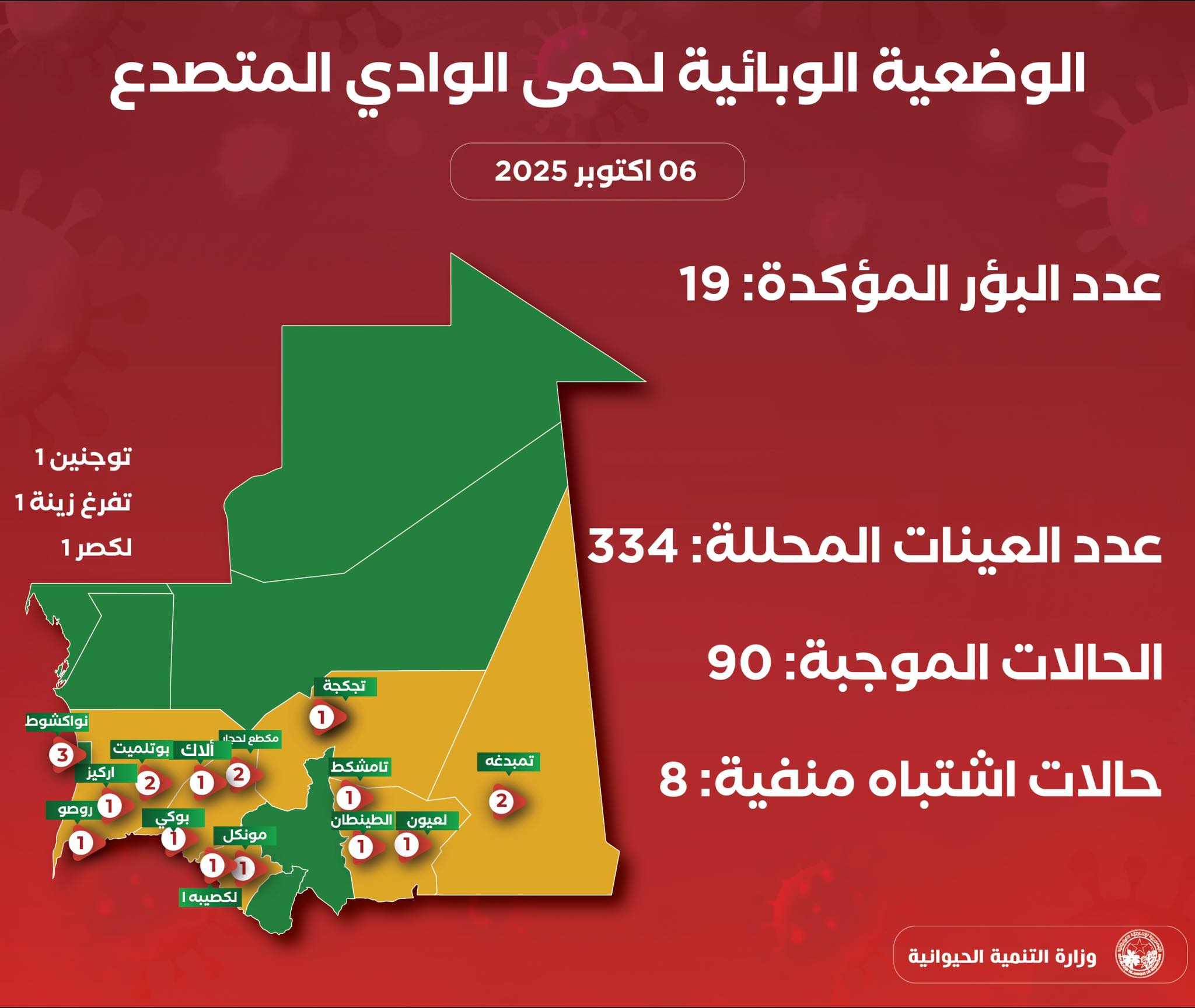 وقالت وزارة التنمية الحيوانية في بيان، إن موريتانيا تواجه حاليا موجة من وباء حمى الوادي المتصدع “حيث سجلت أول بؤرة للمرض يوم 15سبتمبر 2025 في قرية الشام التابعة لبلدية دار البركه في مقاطعة بوكى ولاية لبراكنة، ثم سجلت المصالح البيطرية، حتى يوم 5 اكتوبر 2025، ما مجموعه 19 بؤرة موزعة على 16 مقاطعة، تتبع لثمان ولايات.