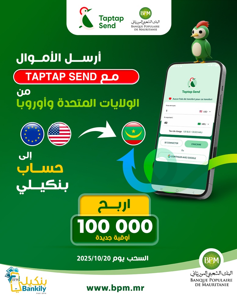 وسيحصل كل من يقوم بتحويل يفوق 50 ألف أوقية جديدة على فرصة مضاعفة للفوز بالجائزة الكبرى، المقرر السحب عليها في 20 أكتوبر 2025.