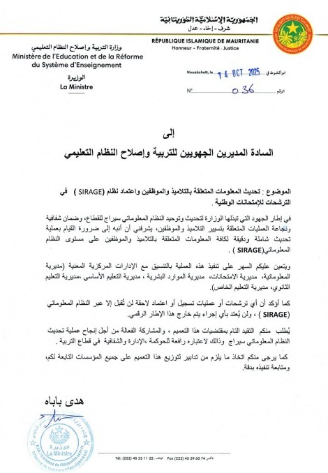 وأكدت وزيرة التربية هدى باباه، في التعميم على أن أي ترشحات أو عمليات تسجيل أو اعتماد لاحقة لن تقبل إلا عبر النظام المعلوماتي (سراج) ولن يتعد بأي إجراء يتم خارج هذا الإطار