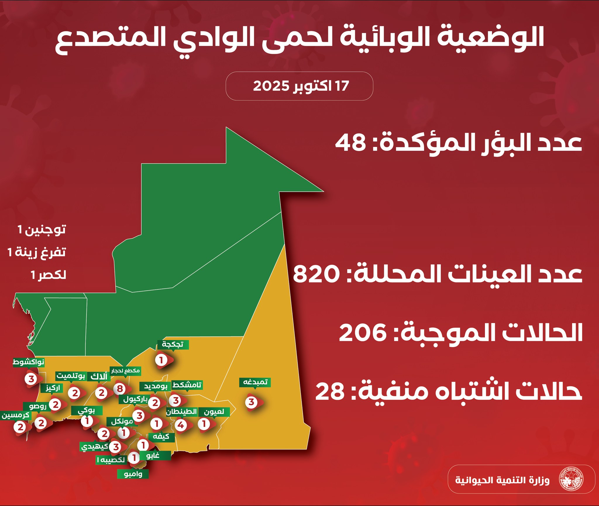 أخبار اليوم. كشفت وزارة التنمية الحيوانية في تقريرها اليوم حول وضعية وباء حمى الوادي المتصدع 2025، استقرارا لأرقام الإصابة بهذه الحمى خلال اليومين الماضيين، حيث لم تتغير الوضعية بين يومي 16 أكتوبر و17 أكتوبر 2025.