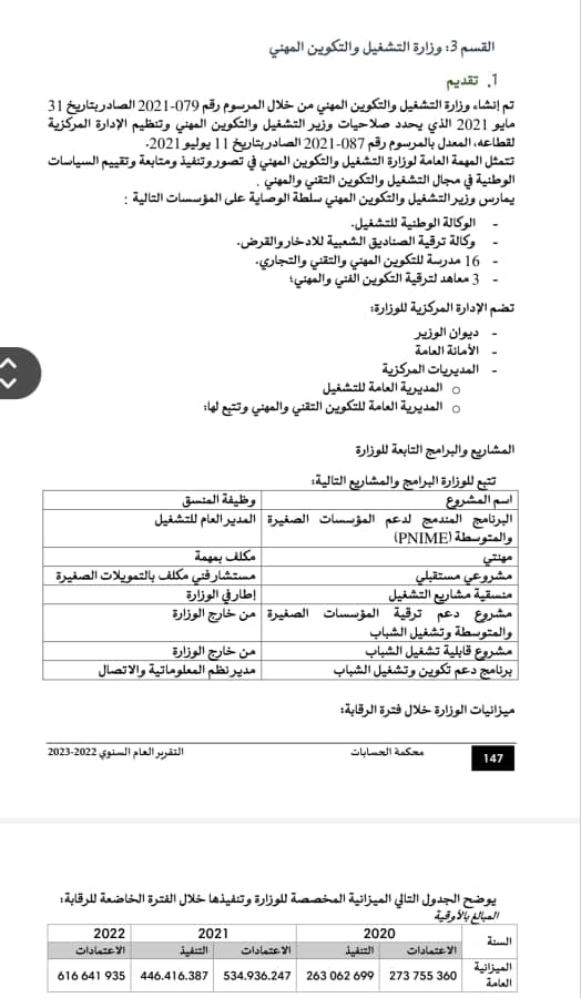 قالت المحكمة إنه خرقا للمرسوم رقم 2021-079 الصادر بتاريخ 31 مايو 2021 الذي يحدد صلاحيات وزير التشغيل والتكوين المهني وتنظيم الإدارة المركزية لقطاعه، المعدل بالمرسوم رقم 2021-087الصادر بتاريخ 11 يوليو ،2021 لاحظت المحكمة تداخلا بين صلاحيات وأهداف مديريات وبرامج الوزارة، مما ولد أعباء جديدة متمثلة في اكتتابات غير مشروعة وعلاوات مزدوجة، وتوظيف الموارد المخصصة لهذه البرامج في غايات لا تخدم أهداف الوزارة.