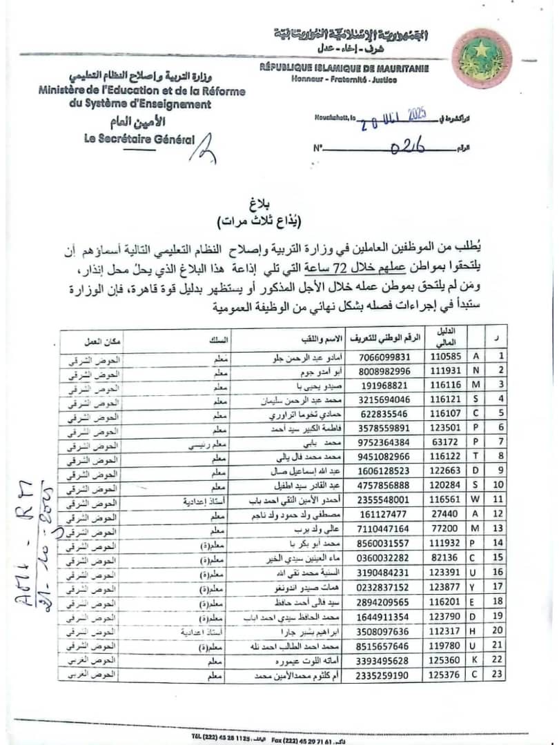 أخباراليوم. وجهت وزارة التربية وإصلاح النظام التعليمي إنذارا لـ163 مدرسا، ملوحة بفصلهم في حال لم يحضروا لأماكن عملهم خلال 72 ساعة.