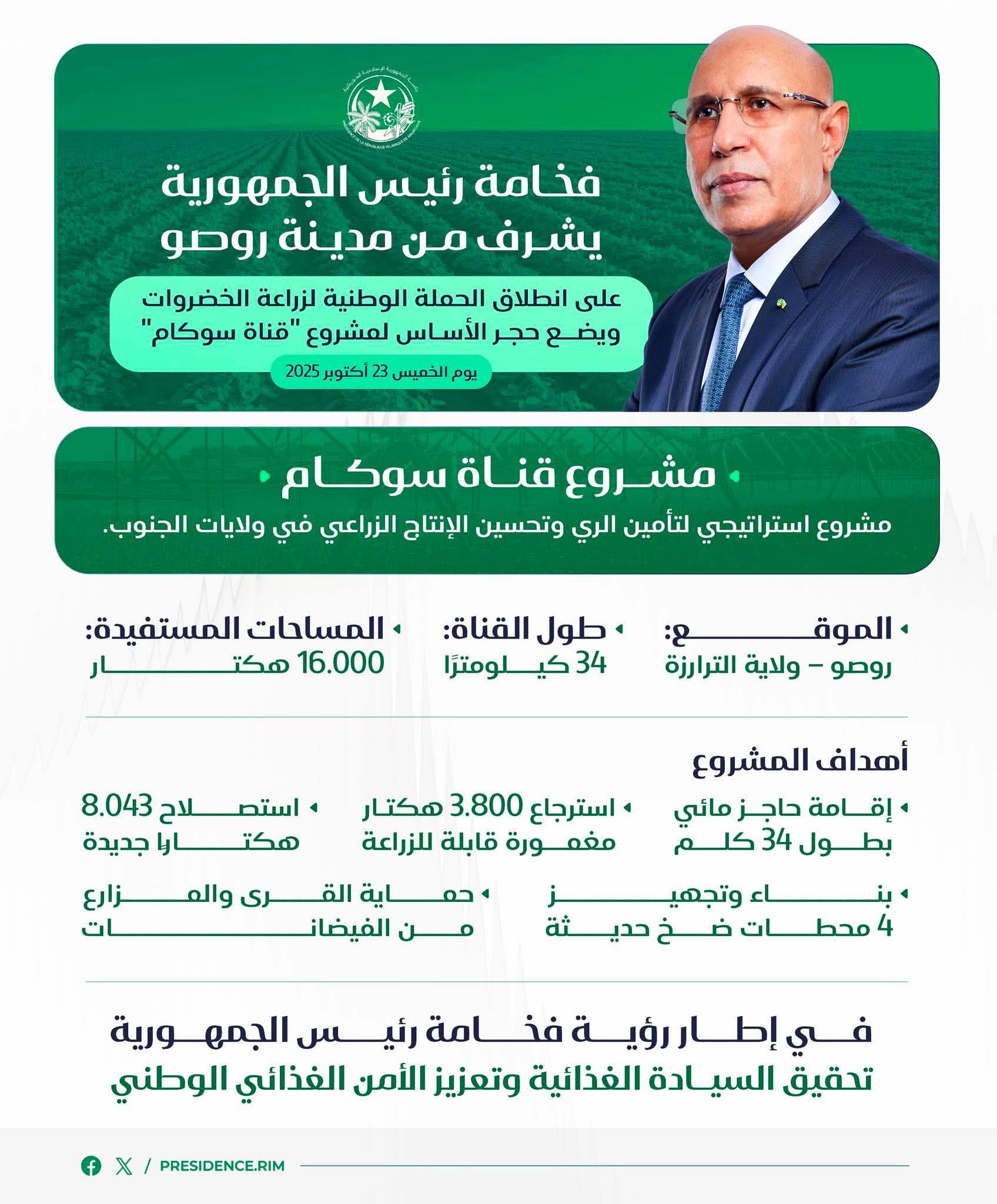 أخبار اليوم. مشروع استراتيجي ضمن حزمة المشاريع التي سيتم إطلاقها تنفيذا لبرنامج صاحب الفخامة رئيس الجمهورية محمد ولد الشيخ الغزواني في محوره الهادف الي تحقيق السيادة الغذائية.