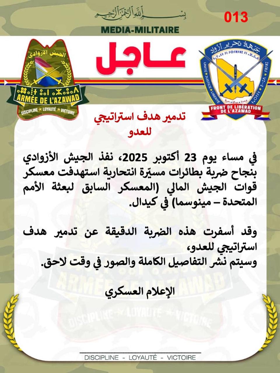 أخباراليوم – تبنت جبهة تحرير أزواد هجوما قالت إن مقاتليها نفّذوه بالمسيّرات على هدف استراتيجي في منطقة كيدال.