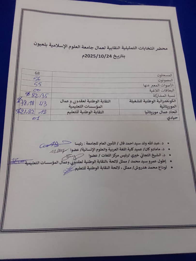 أخباراليوم.  – فازت الكونفدرالية الوطنية للشغيلة الموريتانية بنسبة 78.18‎‎‎% في انتخابات التمثيلية النقابية في  جامعة العلوم الإسلامية بالعيون، والتي نظمت اليوم.
