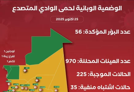 أخبار اليوم. أعلنت وزارة التنمية الحيوانية تسجيل 56 بؤرة لحمى الوادي المتصدع في 25 مقاطعة بـ11 ولاية حتى 25 أكتوبر 2025، مؤكدة نفي 35 بؤرة مشتبه بها بعد تحليل 970 عينة، منها 225 إيجابية.
