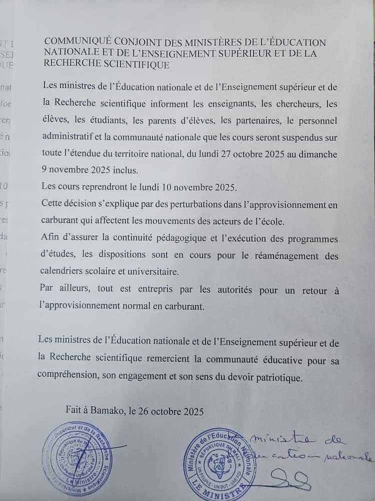 وأوضح بيان مشترك صادر عن وزارتي التربية الوطنية، والتعليم العالي والبحث العلمي، أن “الدروس ستُعلق في جميع أنحاء التراب الوطني (المالي) ابتداء من يوم الاثنين 27 اكتوبر 2025 إلى غاية يوم الأحد 9 نوفمبر 2025، وسيستأنف التدريس يوم الاثنين 10 نوفمبر 2025”.