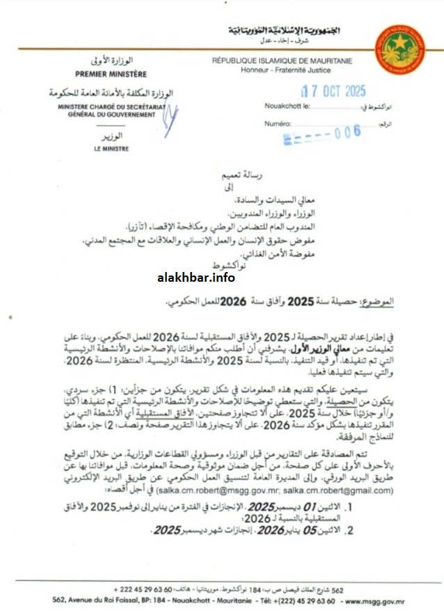 أخباراليوم. – أمر الوزير الأمين العام للحكومة مختار حسينو لام أعضاء الحكومة ومن في رتبتهم بإعداد حصيلة بالإصلاحات والإنجازات التي قامت بها قطاعاتهم الحكومية خلال سنة 2025، وكذا آفاق عملهم للعام 2026.
