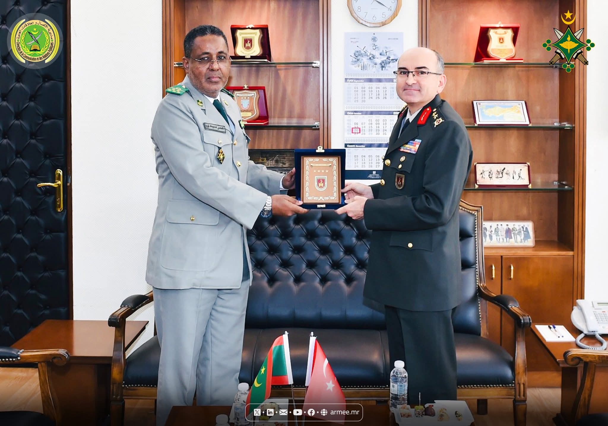 أخبار اليوم. في إطار التعاون العسكري بين موريتانيا والجمهورية التركية، أدى وفد عسكري، بقيادة العقيد عمر ولد سيدي؛ قائد المنطقة العسكرية السابعة، وعضوية كل من العقيد عبد الله ولد محمد فال؛ مدير الاتصال وأنظمة المعلوماتية، والعقيد المهدي محمود؛ مساعد قائد المنطقة العسكرية الخامسة، والعقيد أعلي أصنيبه؛ مساعد قائد المنطقة العسكرية الثانية، زيارة عمل للقوات البرية التركية، المكلفة بأمن الحدود من الفترة 19 إلى 24 أكتوبر 2025، لبحث أوجه التعاون المستقبلي المشترك بين البلدين في مجال أمن الحدود.