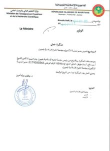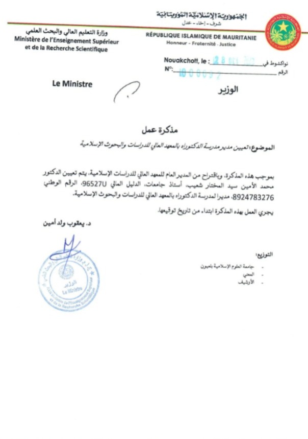أخباراليوم. – عيّن وزير التعليم العالي والبحث العلمي يعقوب ولد امين اليوم الثلاثاء رئيسين لمدرسة الدكتوراه بالمعهد العالي للدراسات والبحوث الإسلامية في نواكشوط، وجامعة العلوم الإسلامية في العيون شرق البلاد.