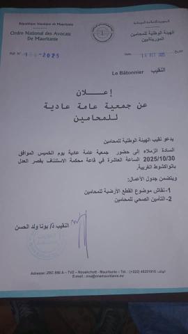 أخبار اليوم. دعا نقيب الهيئة الوطنية للمحامين الموريتانيين، الأستاذ ذ/ يونتا ولد الحسن، جميع الزملاء المحامين إلى حضور جمعية عامة عادية، مقرر عقدها صباح الخميس 30 أكتوبر 2025، عند الساعة العاشرة، وذلك في قاعة محكمة الاستئناف بقصر العدل بنواكشوط الغربية.