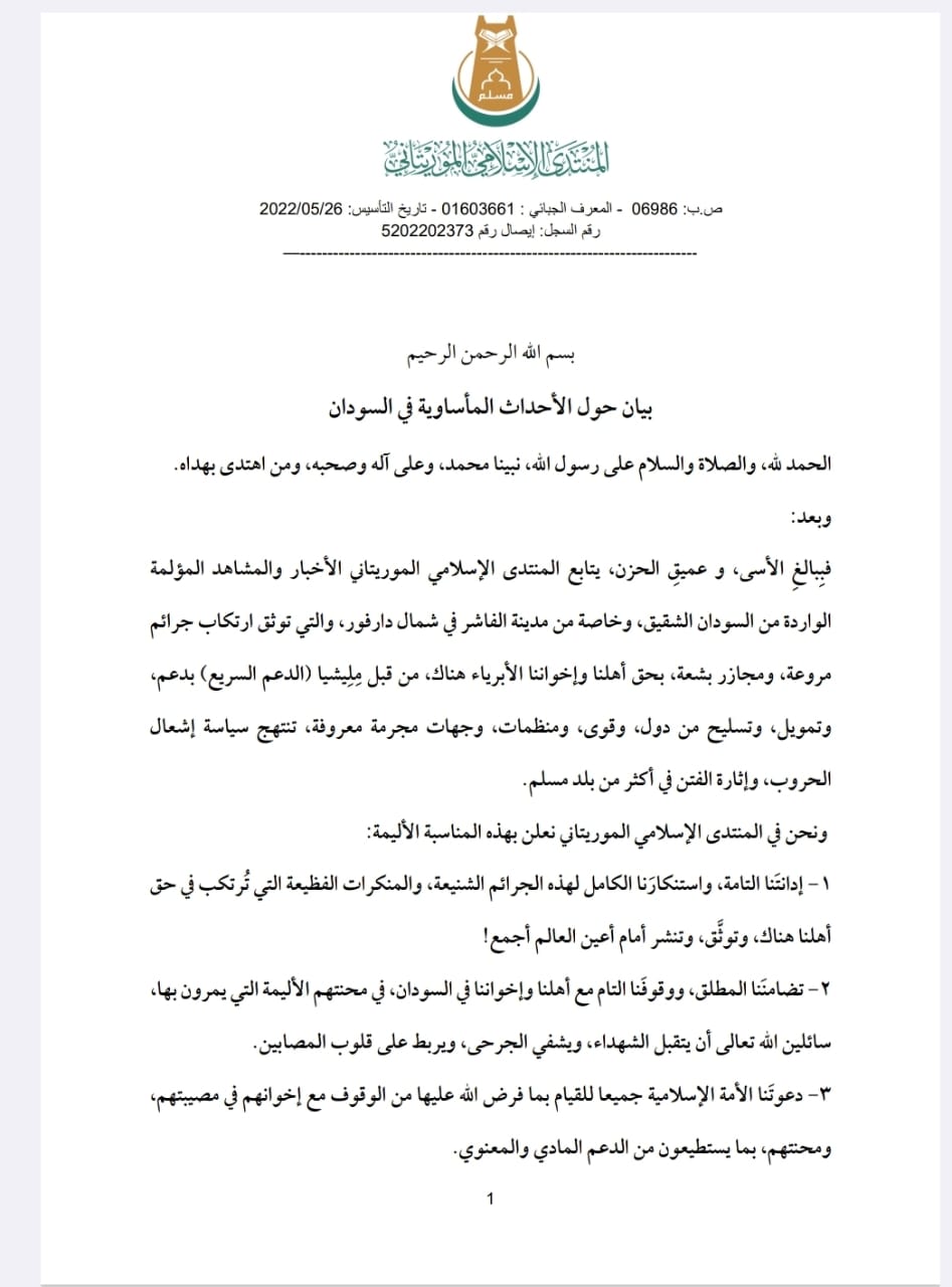 أخباراليوم – أعلن المنتدى الإسلامي الموريتاني تضامنَه ووقوفَه التام مع أهل السودان، في محنتهم التي يمرون بها، داعيا الأمة الإسلامية للقيام بما فرض الله عليها من الوقوف مع إخوانهم في مصيبتهم، وبما يستطيعون من الدعم المادي والمعنوي.
