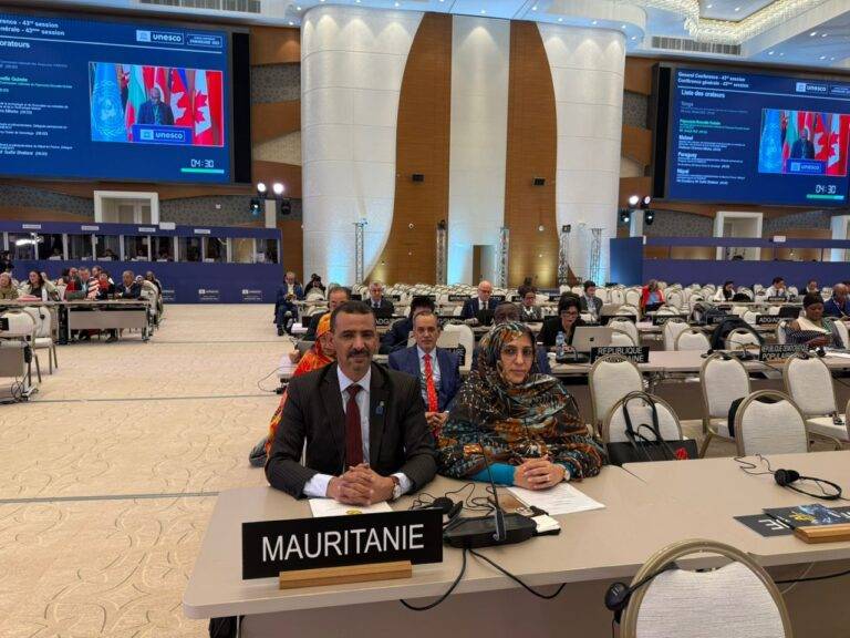 وحضر الجلسة صاحبة السعادة السيدة مولاتي المختار لمحيميد، السفيرة المندوبة الدائمة لبلادنا لدى اليونسكو، إلى جانب أعضاء الوفد الموريتاني المشارك، من وزارة الثقافة والمندوبية الدائمة بالمنظمة، في أعمال هذه الدورة التي تشهد مشاركة واسعة من وزراء الثقافة ومندوبي الدول الأعضاء وممثلي المنظمات الدولية والإقليمية.