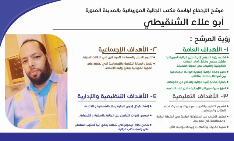 وتأتي هذه الخطوة بعد اجتماع أقامته سعادة القنصل القائم بالأعمال فاطمة بنت شيخنا، دعت فيه الجالية الموريتانية في المدينة المنورة إلى ضرورة إيجاد مكتب توافقي تتوحد فيه جهود الجالية بالمدينة المنورة، وهو ما لبته مختلف قبائل الجالية، حيث اجتمع نقباؤها في بيت الشاعر أبو العلاء الشنقيطي، وشكلوا جمعية عمومية تضم أكثر من ثلاثين قبيلة، وقد اجمع الحضور على ترشيح الشاعر أبو العلاء الشنقيطي لرئاسة مكتب الجالية، وذلك لما يتمتع به من شخصية قيادية، رائدة في مجال الثقافة والاعلام، والعلاقات الواسعة داخل المملكة، وخارجها، ويعتبر الشاعر أبو العلاء الشنقيطي أحد شخصيات الشنقيطة القليلة في بلاد الحرمين التي ما تزال متمسكة بالأصالة الشنقيطية، والاعتزاز بالوطن، وقد برهن على ذلك من خلال تمسكه بزيه الرسمي الموريتاني في جميع نشاطاته الثقافية والإعلامية داخل المملكة العربية السعودية، بينما غالبية أبنائنا هناك، انصهروا في المجتمعات الخليجية، ولم يعد للكثيرين منهم تعلق بماضي الشناقطة، ولا حاضر موريتانيا، إلا ما يتعلق بالأوراق الثبوتية لا غير.