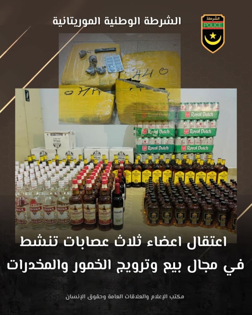 أخبار اليوم.     أعلنت الشرطة الموريتانية، أن المكتب المركزي لمكافحة المخدرات والمؤثرات العقلية، تمكن من تفكيك واعتقال أعضاء ثلاث عصابات تنشط في مجال بيع وترويج الخمور والمخدرات داخل العاصمة نواكشوط.