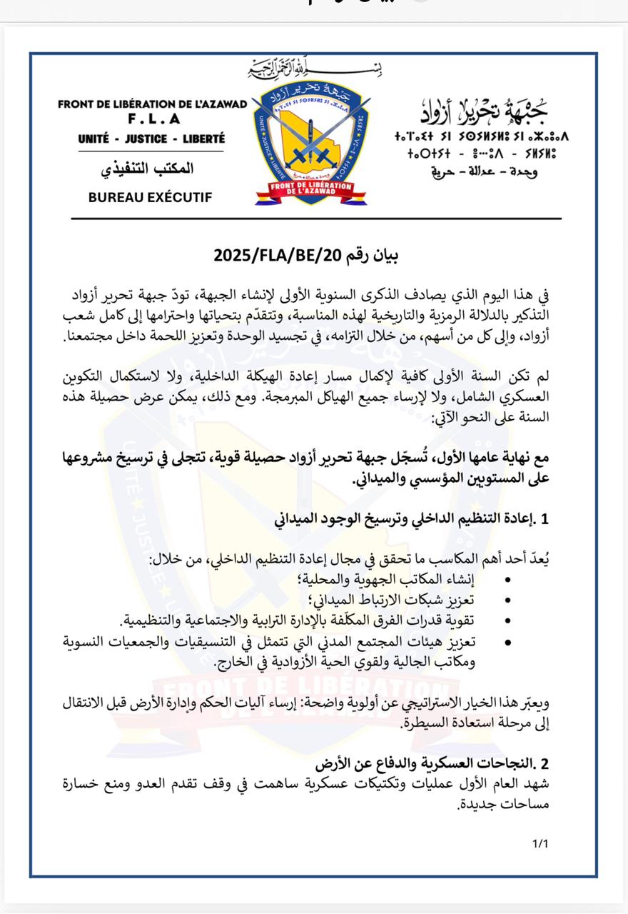 أخباراليوم. أعلنت جبهة تحرير أزواد اليوم الأحد حصيلة أدائها المؤسسي والميداني، وذلك بمناسبة مرور الذكرى الأولى لإنشائها.
