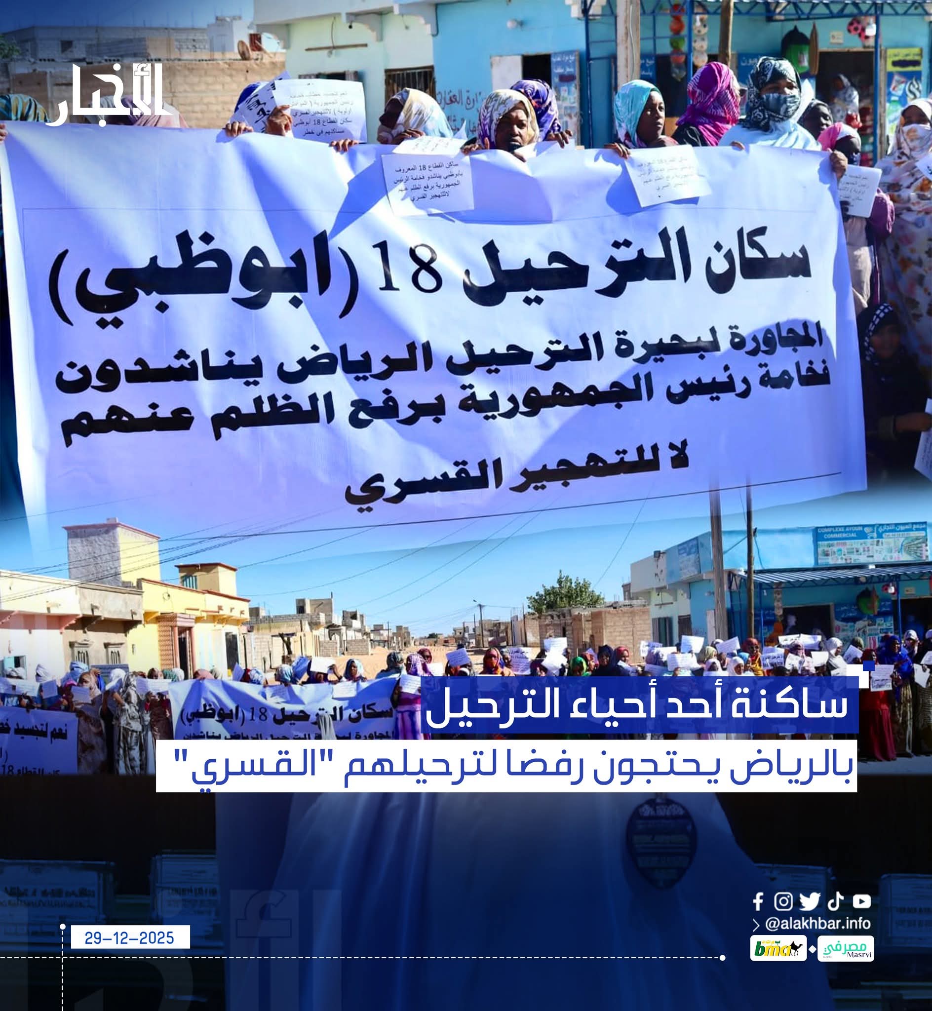 أخباراليوم احتج اليوم الإثنين عدد من ساكنة ترحيل أبوظبي 18 التابع لمقاطعة الرياض بولاية نواكشوط الجنوبية، رفضا لقرار وزارة الأملاك ترحيلهم الذي وصفوه بـ”القسري” من الحي الذي سكنوه منذ سنوات عديدة، مطالبين الرئيس محمد ولد الغزواني بالتدخل لإنصافهم.