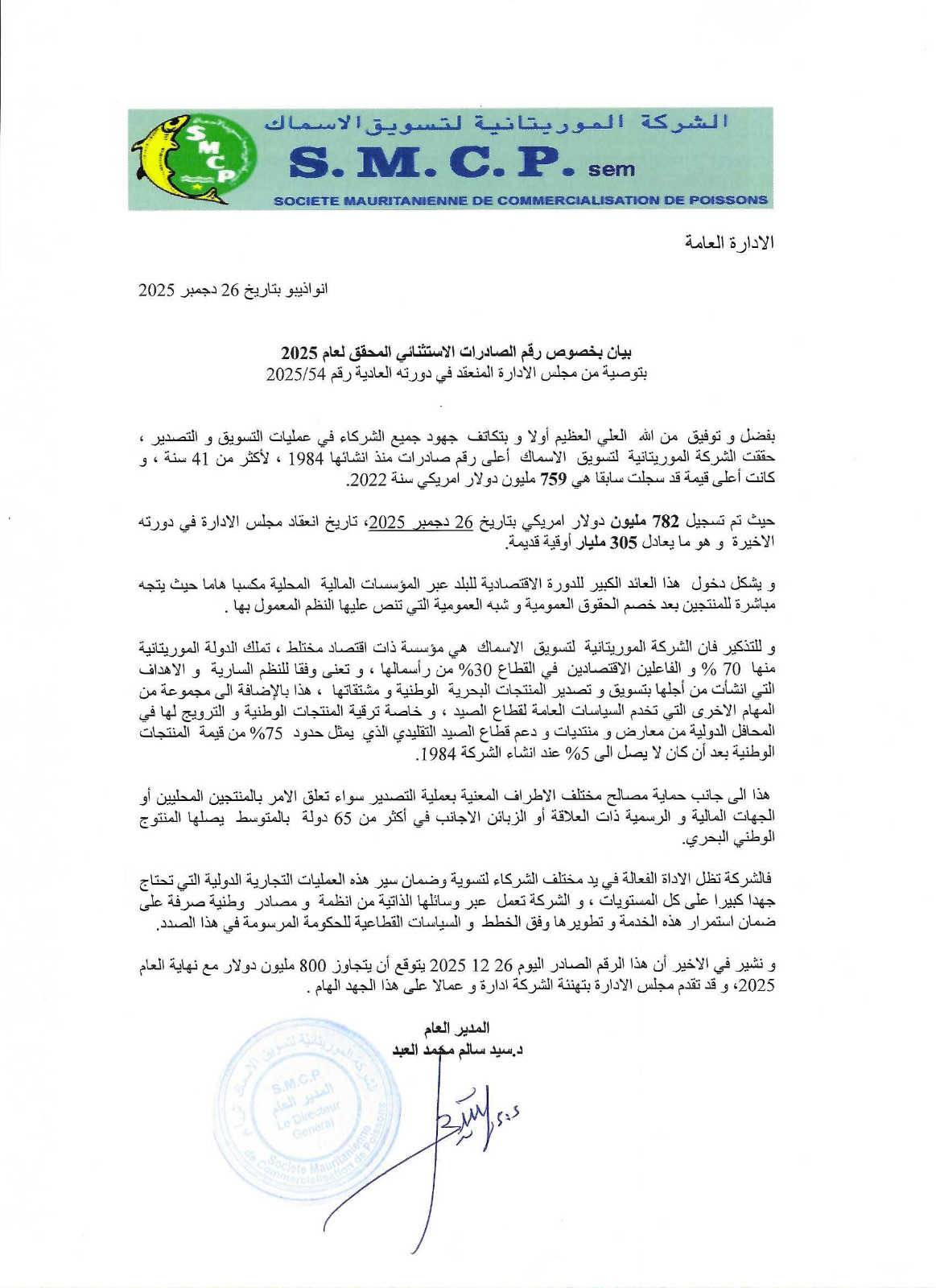 أخباراليوم. أعلنت الشركة الموريتانية لتسويق الأسماك أن صادراتها بلغت حتى ديسمبر الجاري 782 مليون دولار، أي 305 مليار أوقية قديمة.