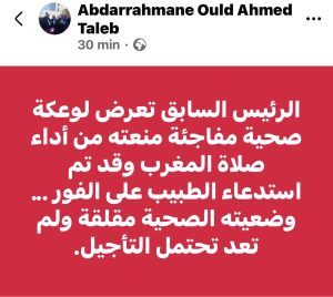 أخباراليوم. قال المحامي عبد الرحمن ولد زروق إن موكله الرئيس السابق محمد ولد عبد العزيز، تعرض لوعكة صحية مفاجئة، مساء اليوم الاثنين، منعته من أداء صلاة المغرب.