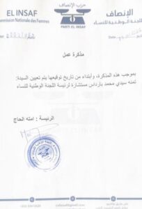 أخبار اليوم. أصدرت رئيسة اللجنة النسائية بحزب الإنصاف مذكرة عمل بموجبها يتم تعيين الناشطة في الحزب تومنه سيدي محمد بارداس مستشارة الجنة النسائية.