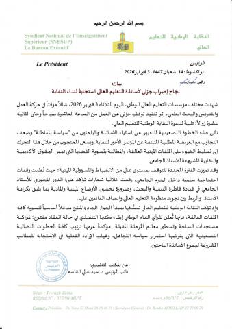 أخبار اليوم.    أعلنت النقابة الوطنية لأساتذة التعليم العالي نجاح إضراب نفذه الأساتذة المنضوون تحت لوائها، اليوم الثلاثاء 3 فبراير 2026، بمؤسسات التعليم العالي الوطنية.