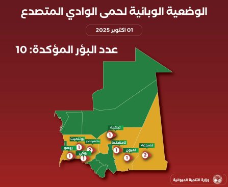 أخبار اليوم. تواجه موريتانيا حاليا، موجة من وباء حمى الوادي المتصدع، حيث سجلت أول بؤرة للمرض يوم 15سبتمبر 2025, في قرية الشام التابعة لبلدية دار البركه في مقاطعة بوكى, ولاية لبراكنة. وقد سجلت المصالح البيطرية، حتى اليوم 1 اكتوبر 2025، ما مجموعه 10بؤر موزعة على 8 مقاطعات تتبع لخمس ولايات، كما هو موضح في الصورة […]