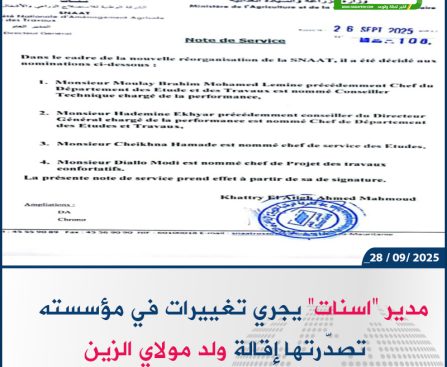 أخبار اليوم. ــ أجرى المدير العام للشركة الوطنية للاستصلاح الزراعي والأشغال “اسنات” خطري ولد العتيق تغييرات في إدارات ومصالح مؤسسته تصدرتها إقالة الإطار البارز بالشركة ومدير الأشغال السابق بها مولاي إبراهيم محمد الأمين ولد مولاي الزين، وتعيينه مستشارا فنيا. وجاء في المذكرة الصادرة في الخامس والعشرين من الشهر الجاري والتي تعتبر أول إجراء يتخذه المدير العام […]