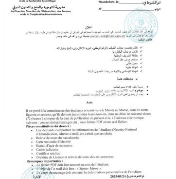أخبار اليوم. أعلنت وزارة التعليم العالي والبحث العلمي، من خلال مديرية التوجيه والمنح والتعاون الدولي، أن الطلاب الموريتانيين الموجهين للماستر في المغرب مطالبون بإرسال ملفاتهم في أجل لا يتجاوز 72 ساعة من تاريخ نشر هذا الإعلان، عبر البريد الإلكتروني: contact-dob@mesrs.gov.mr، على أن يكون الملف في صيغة PDF واحدة. ويتكون الملف المطلوب من: طلب يتضمن […]
