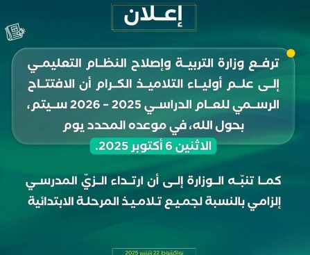 أخبار اليوم. – أكدت وزارة التربية وإصلاح النظام التعليمي أن الافتتاح الرسمي للعام الدراسي 2025 – 2026 سيكون في موعده المحدد يوم الإثنين 6 أكتوبر 2025. كما أكدت الوزارة في إعلان موجه إلى أولياء التلاميذ أن ارتداء الزي المدرسي إلزامي بالنسبة لجميع تلاميذ المرحلة الابتدائية. وكانت وزارة التربية والداخلية قد دعت في تعميم […]