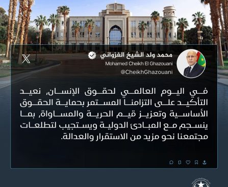 أخباراليوم. عبر الرئيس محمد ولد الغزواني عن التزامه “بتعزيز قيم الحرية والمساواة بما ينسجم مع المبادئ الدولية”. جاء في ذلك في تغريدة له على منصة X: بمناسبة اليوم العالم لحقوق الإنسان. وأضاف الغزواني: “في اليوم العالمي لحقوق الإنسان، نعيد التأكيد على التزامنا المستمر بحماية الحقوق الأساسية وتعزيز قيم الحرية والمساواة، بما ينسجم مع […]