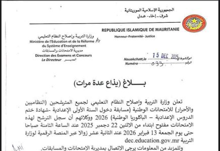 أخبار اليوم. اجتمع مجلس الوزراء اليوم الأربعاء 17 دجمبر 2025، تحت رئاسة صاحب الفخامة السيد محمد ولد الشيخ الغزواني، رئيس الجمهورية. وقد درس المجلس وصادق على مشاريع النصوصالتالية: ‐ مشروع مرسوم يقضي بإنشاء وتنظيم وسير عمل مؤسسة عمومية ذات طابع إداري تدعى الوكالة الوطنية للتكوين التقني والمهني (وكالة تكوين) تشكل هذه الوكالة أداة مرنة […]