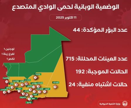 أخباراليوم. ارتفعت بؤر حمى الوادي المتصدع في موريتانيا إلى 44 بؤرة موزعة على22 مقاطعة تتبع لعشر ولايات. ووفق بيان لوزارة التنمية الحيوانية فقد نفت المصالح البيطرية المختصة اشتباه 24 بؤرة وذلك بعد تحليل 715 عينة كانت منها 192 موجبة وتُعد حمى الوادي المتصدع مرضًا فيروسيًا مشتركا موسميا حيواني المنشأ يصيب الحيوانات بشكل أساسي […]