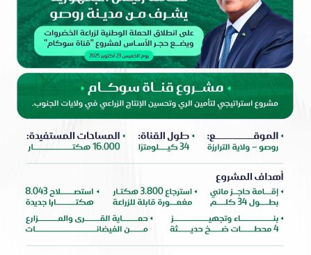أخبار اليوم. مشروع استراتيجي ضمن حزمة المشاريع التي سيتم إطلاقها تنفيذا لبرنامج صاحب الفخامة رئيس الجمهورية محمد ولد الشيخ الغزواني في محوره الهادف الي تحقيق السيادة الغذائية. بعد تنفيذ المرحلة الأولي من كهربة المناطق الزراعية في ولاية اترارزة، وشق الطرق لفك العزلة و شق و تأهيل المحاور المائية، وإعفاء الآليات و المدخلات الزراعية من […]