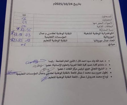 أخباراليوم. – فازت الكونفدرالية الوطنية للشغيلة الموريتانية بنسبة 78.18% في انتخابات التمثيلية النقابية في جامعة العلوم الإسلامية بالعيون، والتي نظمت اليوم. وترشحت الكونفدرالية من النقابة الوطنية لعقدويي وعمال المؤسسات التعليمية. فيما حصل اتحاد عمال موريتانيا على نسبة 21.82%، وذلك عن طريق النقابة الوطنية للتعليم. وبلغ عدد المصوتين 56 من أصل 68 مسجل، […]