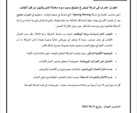 أخباراليوم. دخل مناديب عمال شركة Optorg Mining، العاملة في منجم تازيازت للذهب، في إضراب مفتوح عن العمل احتجاجًا على ما اعتبروه استمرارًا لسوء المعاملة والتهميش من طرف إدارة الشركة. وقال ممثلو العمال في بيان صادر عنهم إن هذا الإضراب يأتي بعد فشل كل المحاولات السابقة لحل المشاكل العالقة، والتي تتراكم منذ سنوات دون تجاوب […]