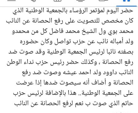 وكالة أخبار اليوم استدعت الجمعية الوطنية النائب البرلماني محمد بوي ولد الشيخ محمد فاضل، اليوم الجمعة للمثول أمام اللجنة المكلفة بدراسة طلب وزير العدل رفع الحصانة عنه. وكان رئيس الجمعية الوطنية محمد ولد مكت، قد أعلن أمس الخميس، أسماء اللجنة المكلفة بدراسة طلب وزير العدل رفع الحصانة عن النائب محمد بوي. وضمت اللجنة 13 عضوا، […]