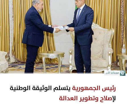 وكالة أخبار اليوم تسلم رئيس الجمهورية، رئيس المجلس الأعلى للقضاء، محمد ولد الشيخ الغزواني، الوثيقة الوطنية لإصلاح وتطوير العدالة، التي تشكل خلاصة عمل المنتديات العامة حول العدالة. وقد قام بتسليم الوثيقة وزير العدل، السيد محمد محمود ولد الشيخ عبد الله ولد بيه، رئيس اللجنة التوجيهية للمنتديات العامة حول العدالة، خلال اللقاء خص به رئيس […]