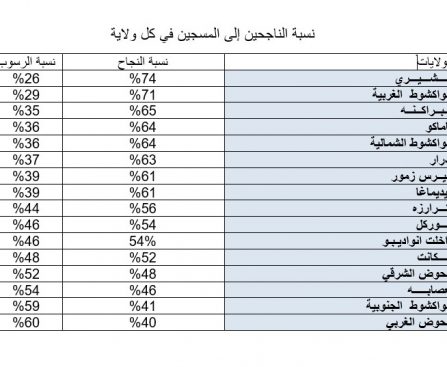 وكالة أخبار اليوم – تصدرت ولاية إنشيري الولايات من حيث نسب النجاح في مسابقة ختم الدروس الإعدادية، وذلك بتسجيلها نسبة نجاح وصلت 74%، فيما تذيلت ولاية الحوض الغربي نسب النجاح حيث لم تتجاوز النسبة فيها 40%. وحلت ولاية نواكشوط الغربية في الرتبة الثانية من حيث نسب النجاح، حيث بلغت نسبة: 71%، وجاءت ولاية […]