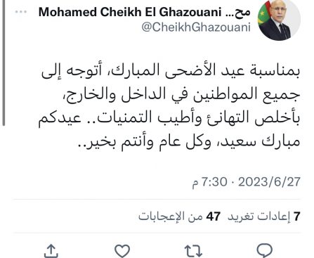 وكالة أخبار اليوم – هنأ الرئيس محمد ولد الغزواني المواطنين الموريتانيين بمناسبة عيد الأضحى المبارك الذي يحل يوم غد الأربعاء. وغرد ولد الغزواني من حسابه في تويتر قائلا: “بمناسبة عيد الأضحى المبارك، أتوجه إلى جميع المواطنين في الداخل والخارج، بأخلص التهاني وأطيب التمنيات.. عيدكم مبارك سعيد، وكل عام وأنتم بخير”.