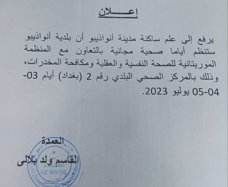 *إعـــلان* يرفع إلى علم ساكنة مدينة أنواذيبو أن بلدية أنواذيبو ستنظم أياما صحية مجانية بالتعاون مع المنظمة الموريتانية للصحة النفسية والعقلية ومكافحة المخدرات ، وذلك بالمركز الصحي البلدي رقم 2 ( بغداد ) أيام 03 05-04 يوليو 2023