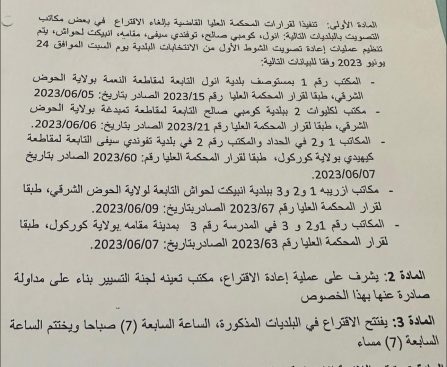 وكالة أخبار اليوم حددت اللجنة الوطنية المستقلة للانتخابات 24 يونيو موعدا لإعادة الانتخابات البلدية بعدة مكاتب في ستة مقاطعات هي: نوال، كومبي صالح، توفندي سيفى، مقامه، انبيكت لحواش. وقالت اللجنة الوطنية المستقلة للانتخابات مداولة لها، إن قرار إعادة الانتخابات ببعض المكاتب يأتي تنفيذا لقرارات المحكمة العليا المتعلقة بإلغاء الاقتراع في هذه المكاتب. […]