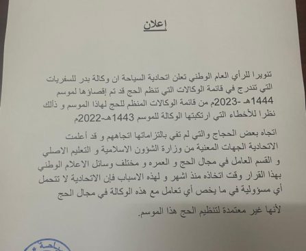 وكالة أخبار اليوم قالت اتحادية السياحة، إن وكالة بدر للسفريات غير معتمدة في تنظيم الحج لهذا العام، وإنها لا تتحمل أي مسؤولية في التعامل مع هذه الوكالة. ولفتت اتحادية السياحة في بيان، إلى أن وكالة بدر للسفريات تم إقصاؤها من قائمة الوكالات المنظمة للحج لهذا الموسم “وذلك نظرا للأخطاء التي ارتكبتها للموسم […]