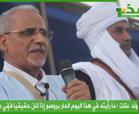 وكالة أخبار اليوم قال رأس اللائحة الوطنية بحزب الإنصاف الفريق المتقاعد محمد ولد مكت إن الصورة التي رآها أمس بروصو في يوم حار، إذا كانت حقيقية، فإنه مطمئن أن لوائح حزب الإنصاف الستة ستفوز في المدينة، مؤكدا أنه إذا لم يحدث الفوز لن يكون هنالك اقتصاد. وخاطب ولد مكت المزارعين قائلا : […]
