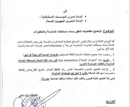 وكالة أخبار اليوم وجه وزير الصحة السيد المختار ولد داهي، اليوم الجمعة، تعميما جديدا إلى مديري المؤسسات الاستشفائية والمديرين الجهويين للصحة، متعلقا بسداد مستحقات المداومة لبعض الوحدات الصحية. وطالب الوزير المؤسسات المعنية بـ”واجب” تسديد مستحقات المداومة لكافة المستحقين في الوحدات الصحية قبل نهاية الشهر، منوها إلى وجوب تقديم المستحقات والنفقات الحساسة الأخرى على حساب […]